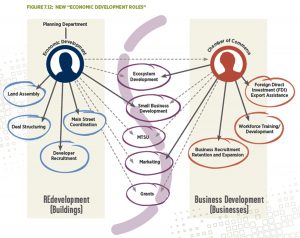 As part of Murfreesboro’s Comprehensive Plan, KKC developed an economic development strategy; the content of which focused on several significant place/asset-based economic development strategies, including engaging MTSU; additional investment in Downtown; incenting and marketing Class A Office Space; positioning its labor force to embrace modern manufacturing; embracing entrepreneurship; pursuing “opportunity economics;” building local economic development capacity; and program-backed marketing.